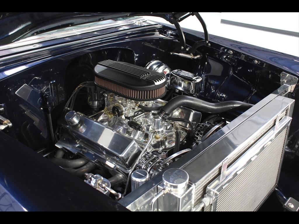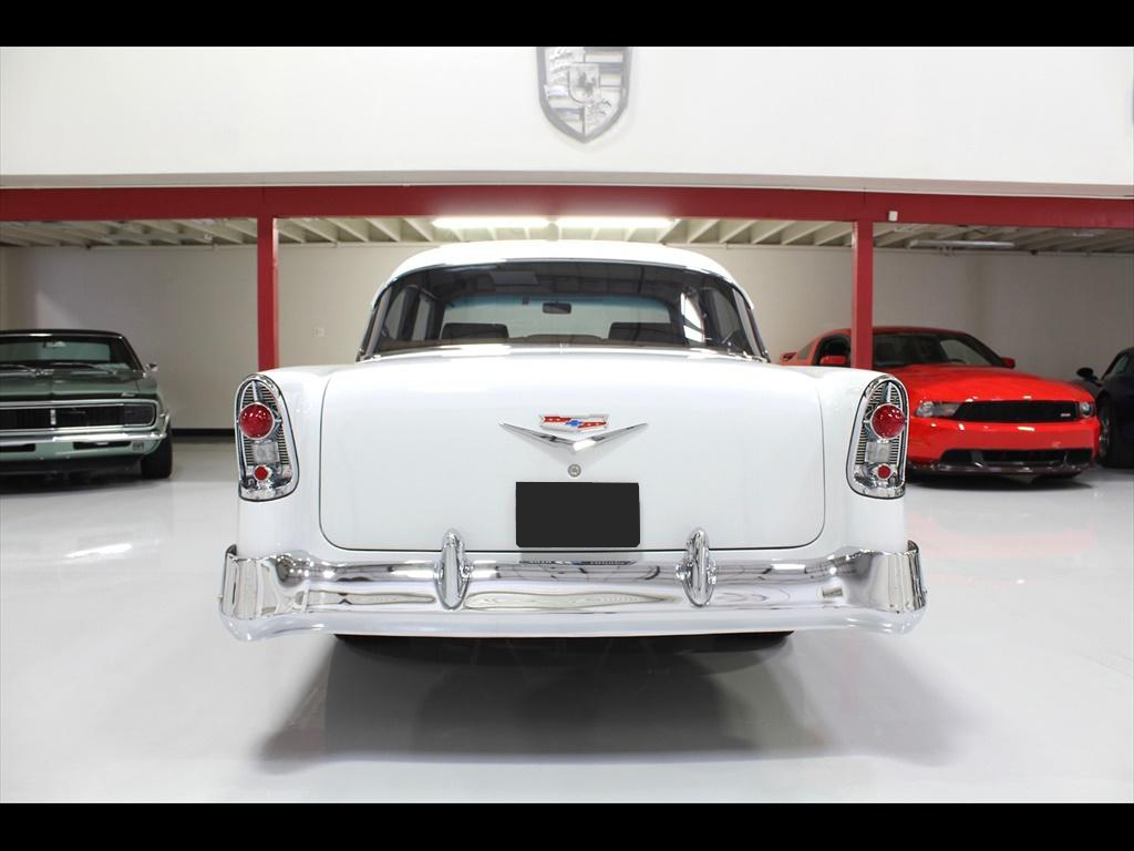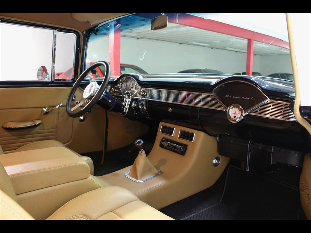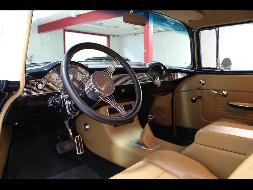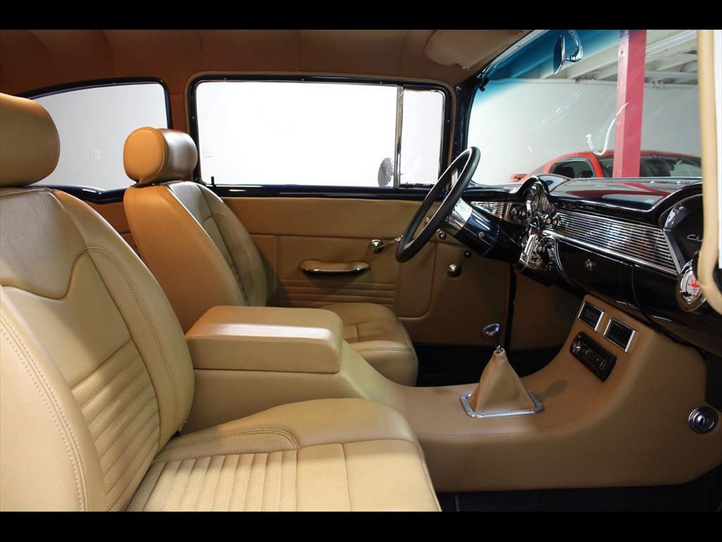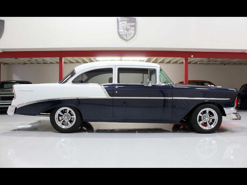 1956 Chevrolet 210 in Orient Blue Metallic & White over Custom Tan Leather Interior. Equipped with a 383ci Stroker Engine mated to a 700R4 Automatic Transmission. An incredible 'no expense spared' frame-off restoration with outstanding quality and attention to detail. The fit and finish on this car is second to none. Less than 900 miles on the car since completion of the build. During the restoration, an extensive list of modifications and upgrades were performed, including; Vintage Air A/C, Rack & Pinion power steering, 4-wheel disc brakes with CPP master cylinder, Tubular A-Arms, Heidts 4-link suspension with coilovers, Danchuk bucket seats with Mercedes Benz Ultra upholstery, Custom center console, Custom sound system with Bluetooth, Autometer instrument gauges, Flaming River tilt steering column, Lokar floor shifter, Alloy hood hinges, March alloy pulley system, Custom smoothed firewall, Dual electric fans, Smoked glass, Dynamat sound proofing throughout the car, custom trunk upholstery with concealed compartment for battery, American racing wheels with Michelin tires, and much more! To add to the already great power of the 383 stroker, the owner installed; Sanderson headers, Edelbrock Performer intake manifold, Edelbrock carburetor, and custom dual exhaust with Flowmaster mufflers. The panel fitment is exceptional and the body is laser straight. The restoration process is documented with photos and an extensive book of receipts. This beautiful show quality 56 Chevy is truly one of a kind.