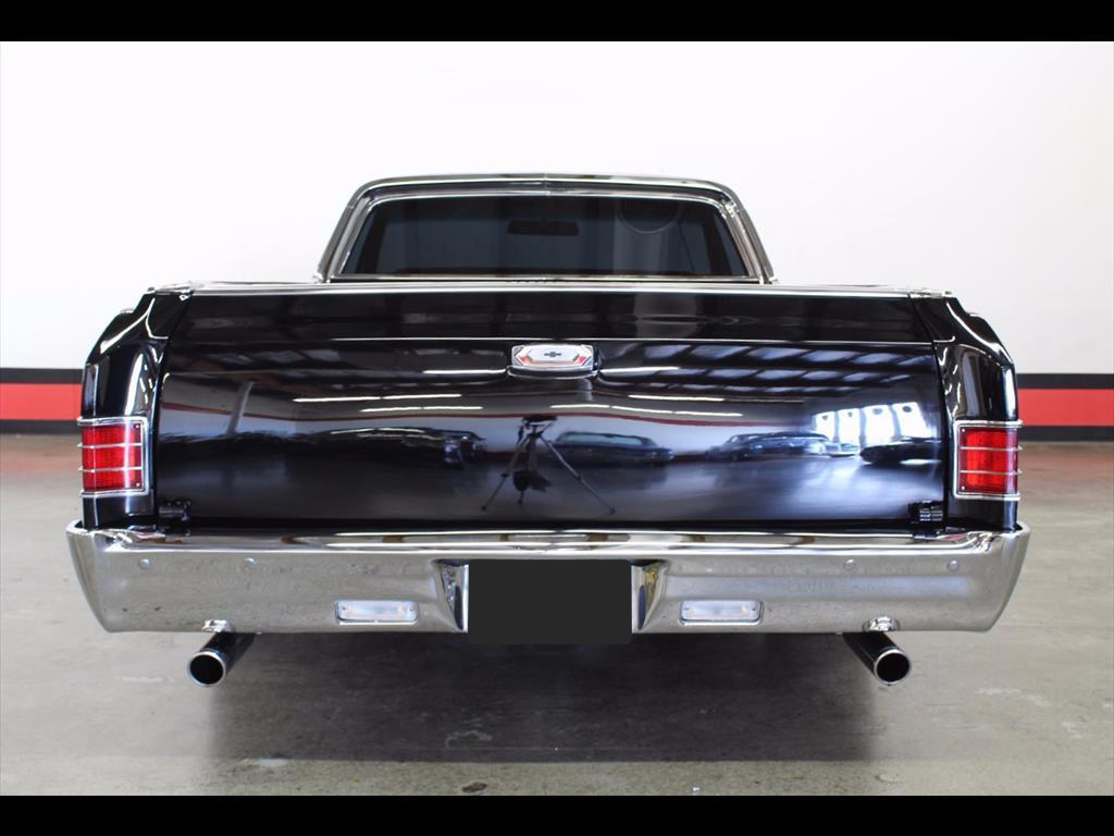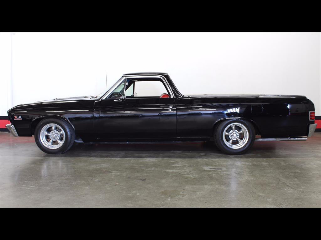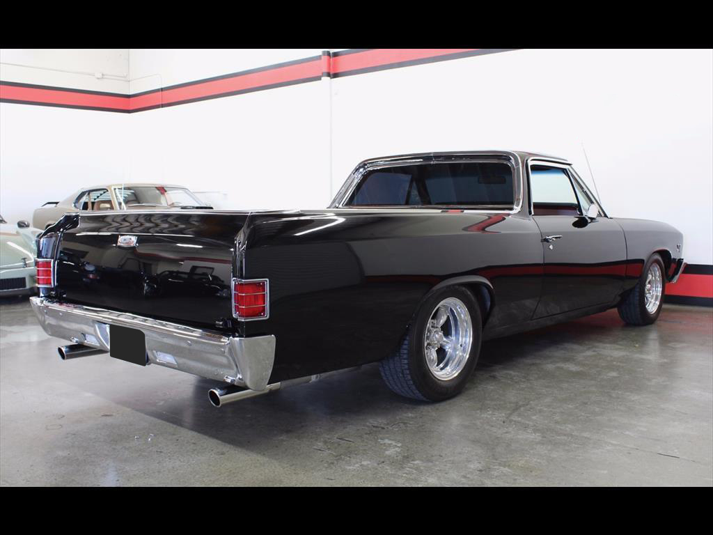 1967 Chevrolet El Camino in Black over Red Custom Interior. Equipped with a 427ci V8 Engine mated to a TH400 Automatic Transmission. California black plate car, it has spent it's entire life in the foothills of Northern California. Fresh engine build from Doug's Speed Shop with less than 1,000 miles on it. Engine is making around 500hp. Balanced and blueprinted. Racing pistons. Edelbrock Performer aluminum heads. Hydraulic lifters. MSD ignition. Be Cool radiator with electric fans. B&M shift kit with billet electronic kick-down. Both the original Turbo 400 Transmission and 12-Bolt rear end have been recently rebuilt. Factory Air Conditioning has been updated and blows cold. Baer disc brakes. Hotchkis adjustable 4-link rear suspension. Power steering. Pioneer CD player. Autometer gauges. A very high quality build; the body is straight, it was rust and dent free before restoration, original floors and bed, the PPG paint is beautiful, the doors shut excellent, windows roll up and down with ease.