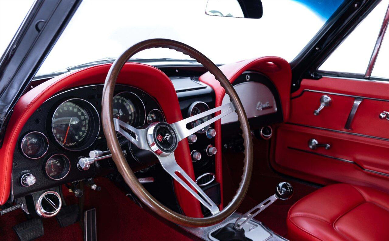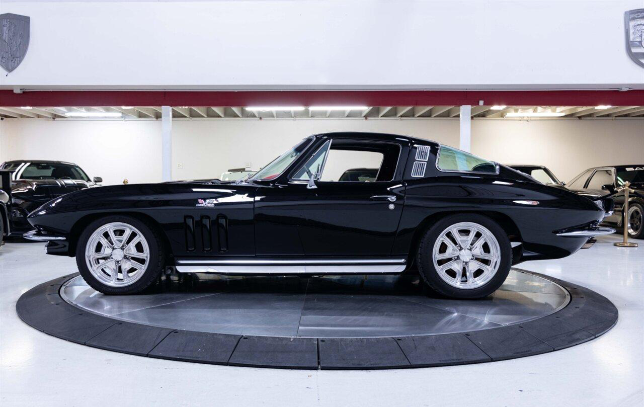 1965 Chevrolet Corvette Coupe in Raven Black over Red Interior. Equipped with a Fuel Injected 496ci Big Block Engine mated to a Tremec 5 Speed Manual Transmission. This incredible Pro Touring Corvette is a complete frame-off restoration. Features include: Holley Sniper Fuel Injection, Air Conditioning, Rack n Pinion Power Steering, 4 Wheel Wilwood Disc Brakes, Coilover Suspension, Ron Davis Aluminum Radiator, Sanderson Headers w/ Custom 3" Stainless Exhaust, MSD Ignition, Rockford Fosgate Components and Subwoofer, Custom 17" Wheels and more! This stunning Corvette is ready to be shown or driven.
