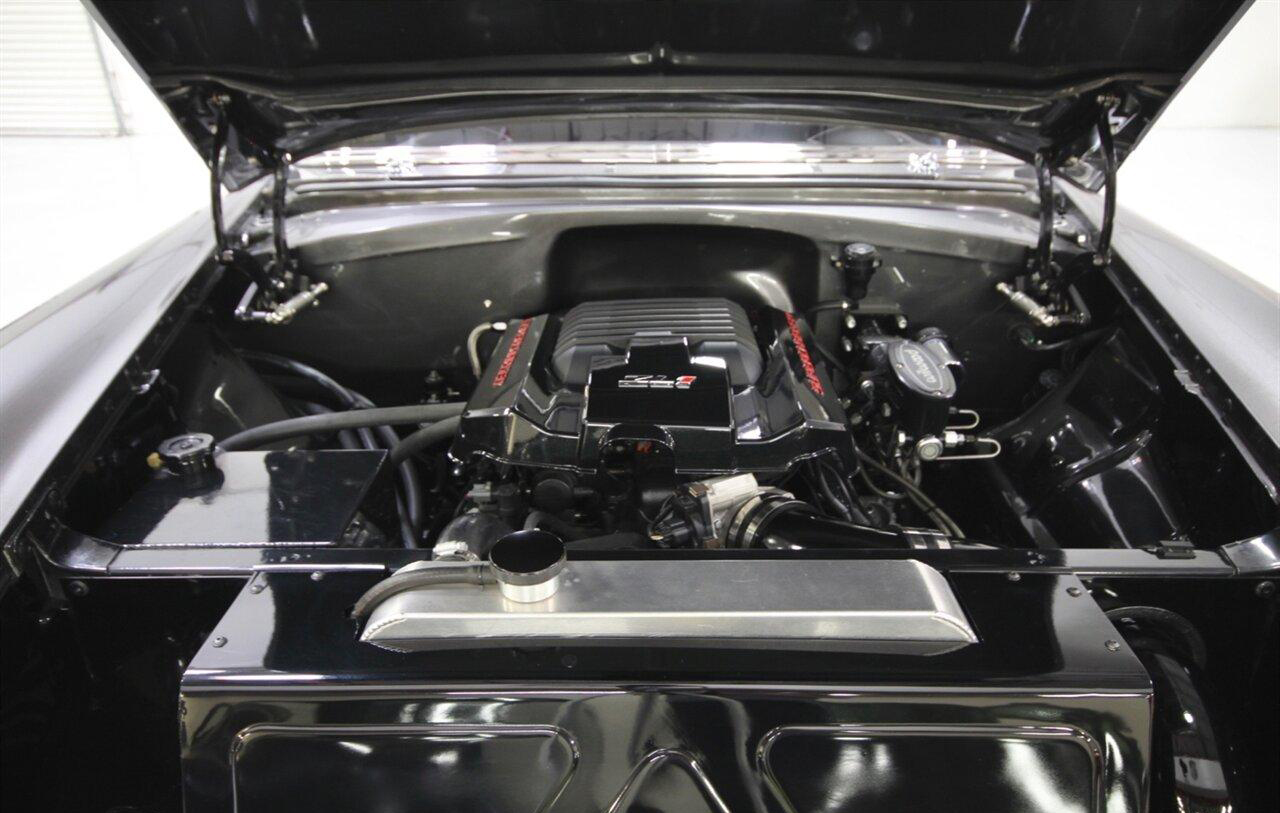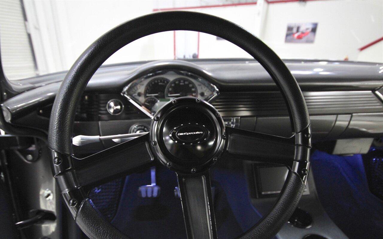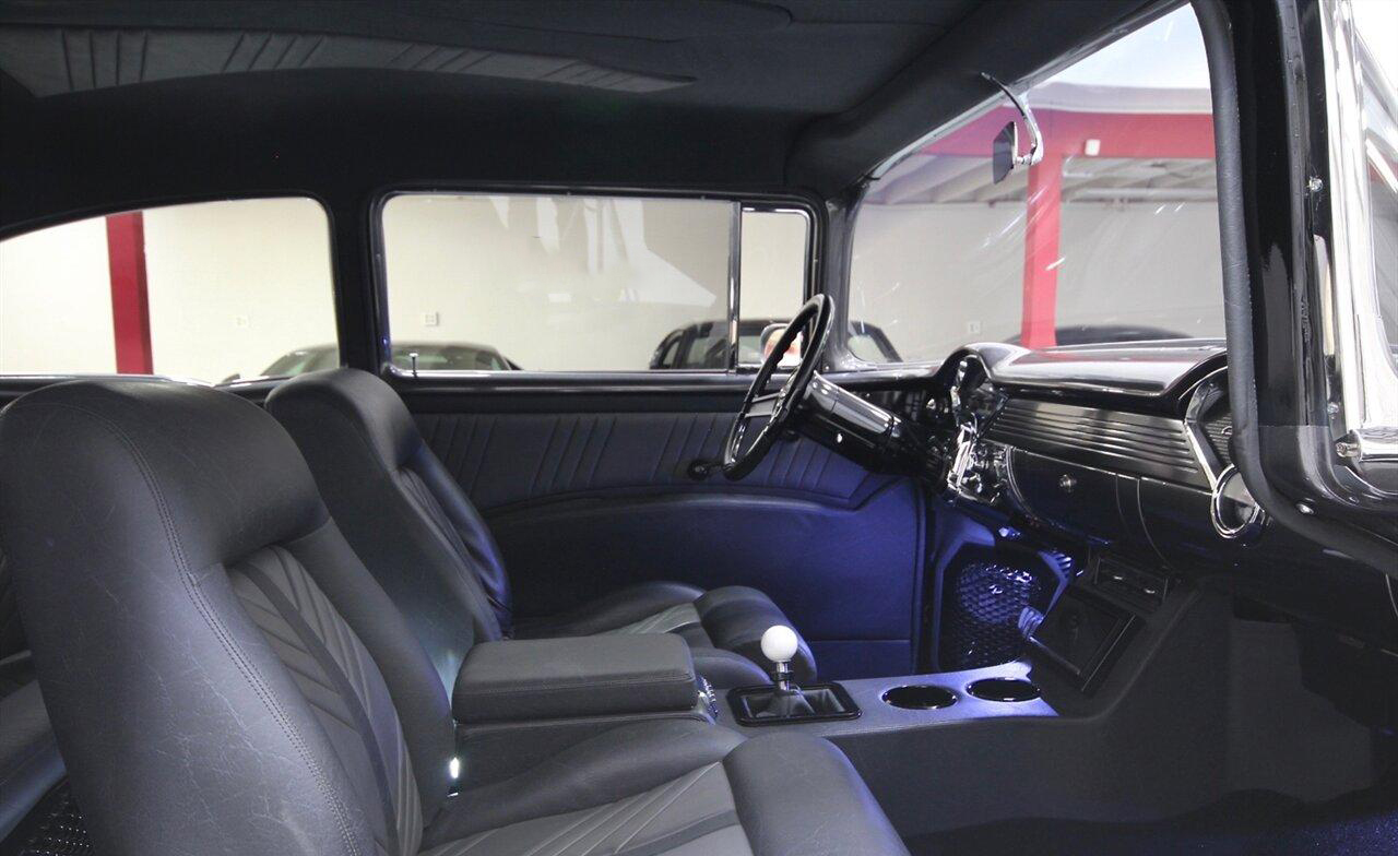 1956 Chevrolet Bel Air in Black and Gunmetal Metallic over Gray Custom Leather Interior. Equipped with a Supercharged LS3 V8 Engine mated to a Tremec T56 6-Speed Manual Transmission. This incredible Tri-Five has undergone a complete nut & bolt restoration and modernized to perform as great as it looks. Very little miles on the car since the build was completed, and it remains in show quality condition all around. The LS3 engine has been fitted with an Eaton supercharger from a Cadillac CTS-V and also features a Cam Motion camshaft, Dual valve springs, Titanium retainers and hardened push-rods, and a Professional street tune. Power steering. Power windows. Wilwood 6-piston disc brakes. Electronic parking brake. Vintage Air A/C. Dakota Digital instrument gauges. Back-up camera. Custom leather upholstered seats, headliner, and center console. Incredible professional sound system with Sony touch-screen head unit. Viper alarm system. CPP tubular control arms. Viking billet adjustable shocks. Caltracs traction bars. B-Forged custom built wheels. Ford 9" rear end with 3.55 gears. Smoked glass. Beautiful brightwork. The car has beautiful body and paint, incredible fit and finish throughout, and it runs and drives incredible.