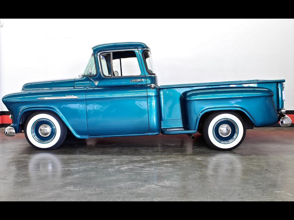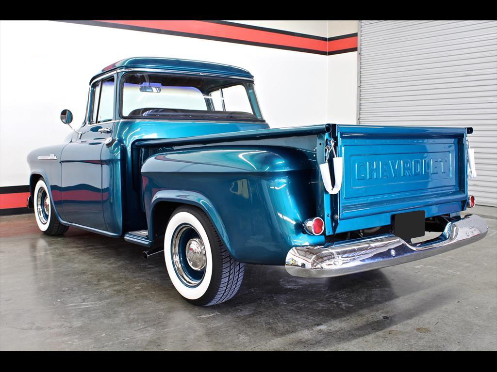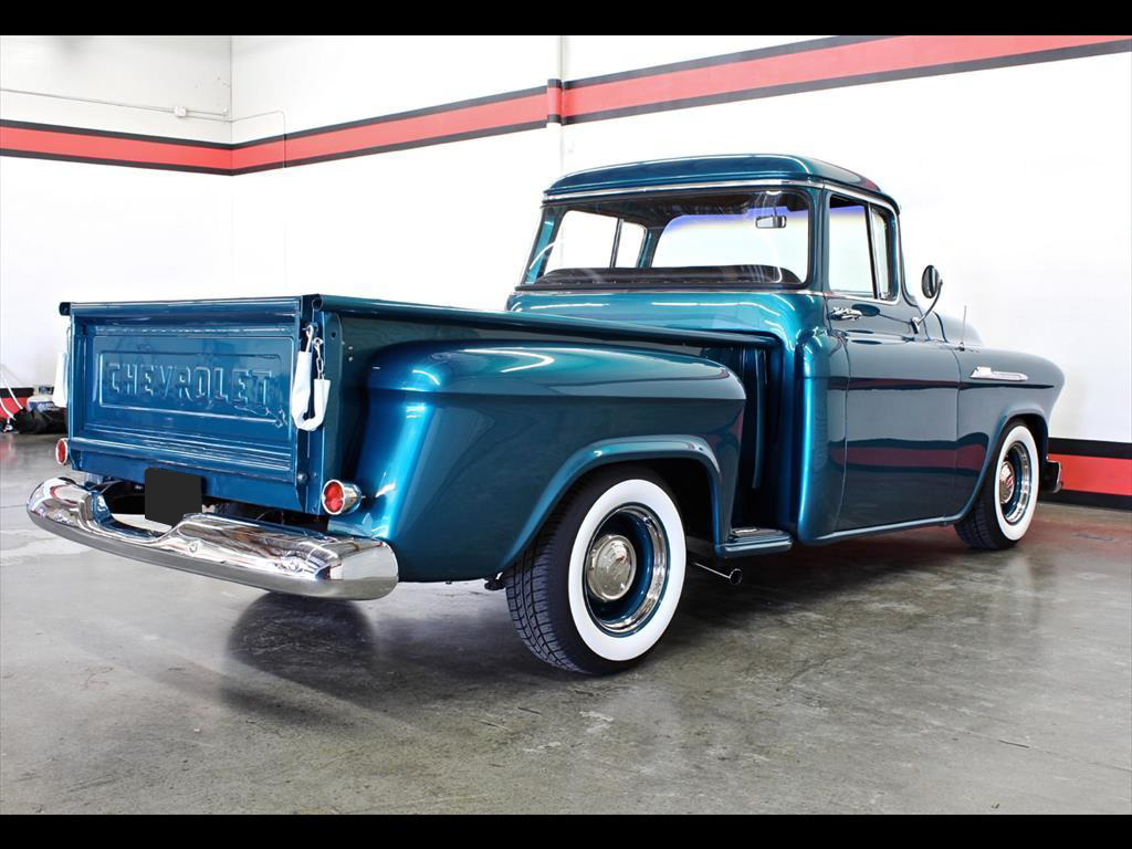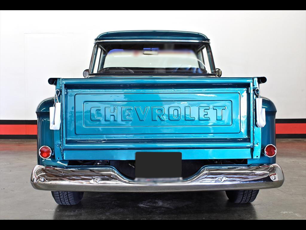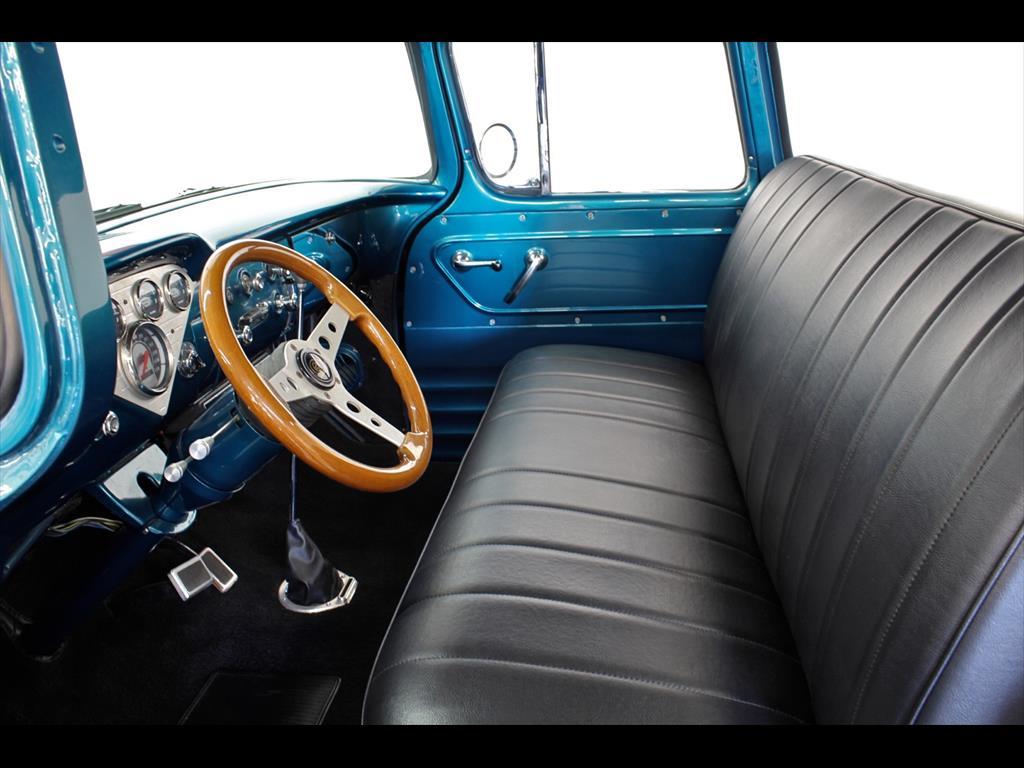 1956 Chevrolet 3100 Big Window in Harbor Blue over matching Interior with Black Vinyl seat. Equipped with a 307ci V8 Engine mated to a 700r4 Transmission. Independent front suspension. Coilovers. Rack & pinion power steering. Disc brakes. Tilt column. A/C blows cold. Stereo system with Clarion speakers. Brand new color matched wheels with center caps and beauty rings. Brand new 3" white wall tires. Brand new birdseye maple wood bed. TPI-Tech gauges. Fuel cell. This beautiful deluxe cab pickup is ready to be shown and driven.
