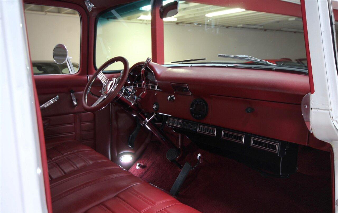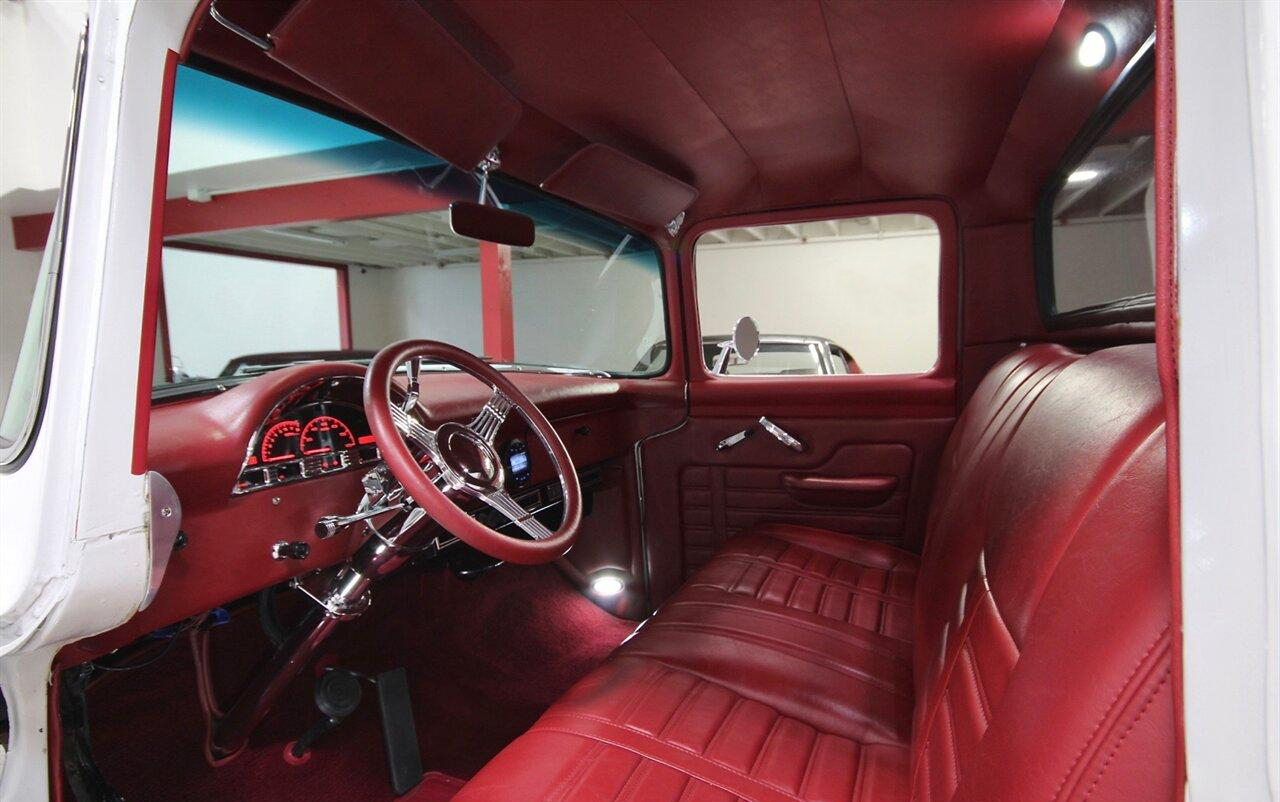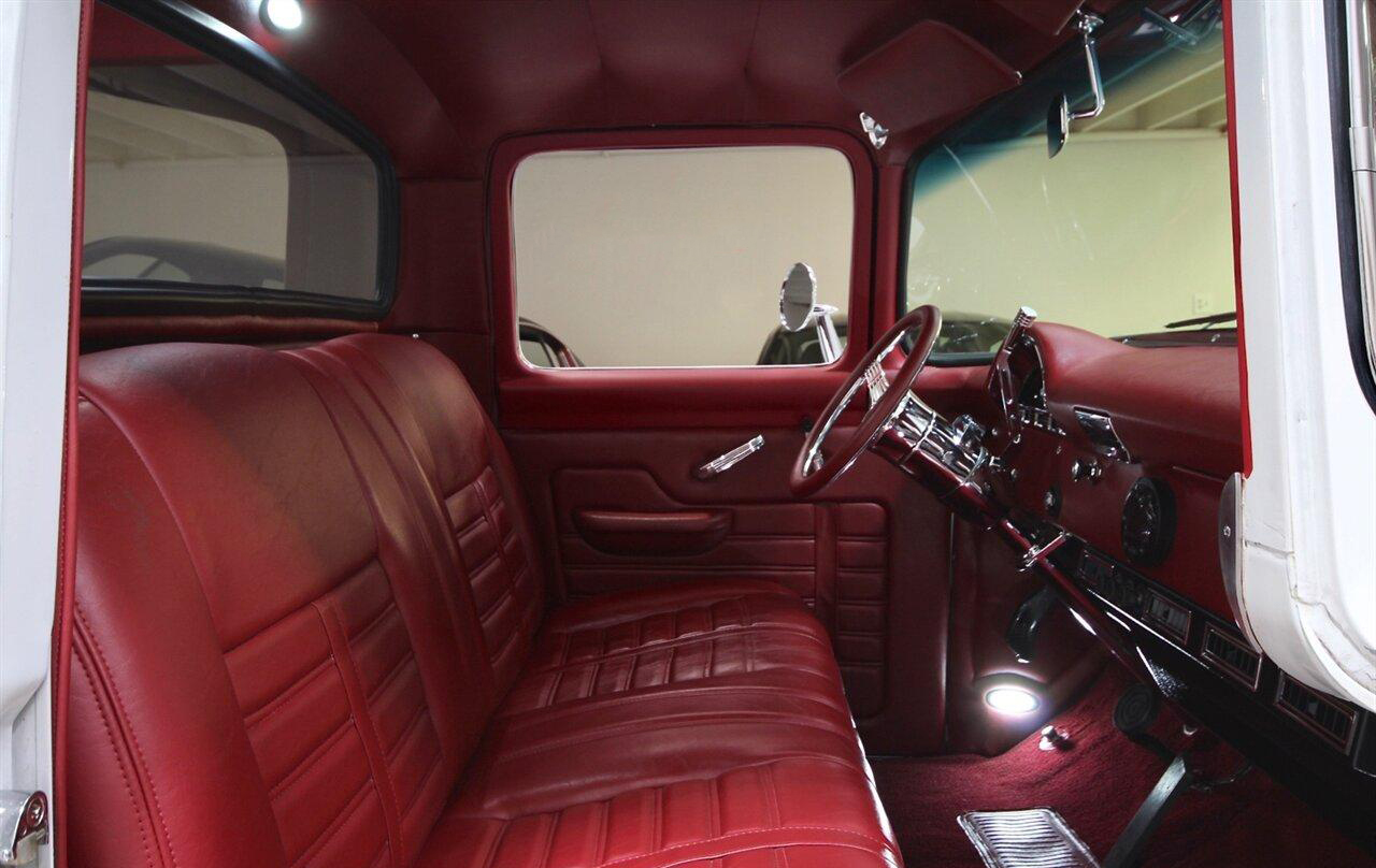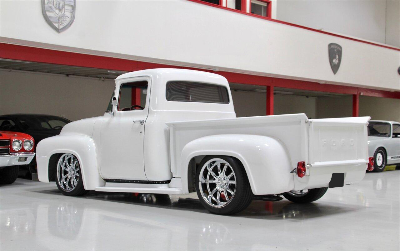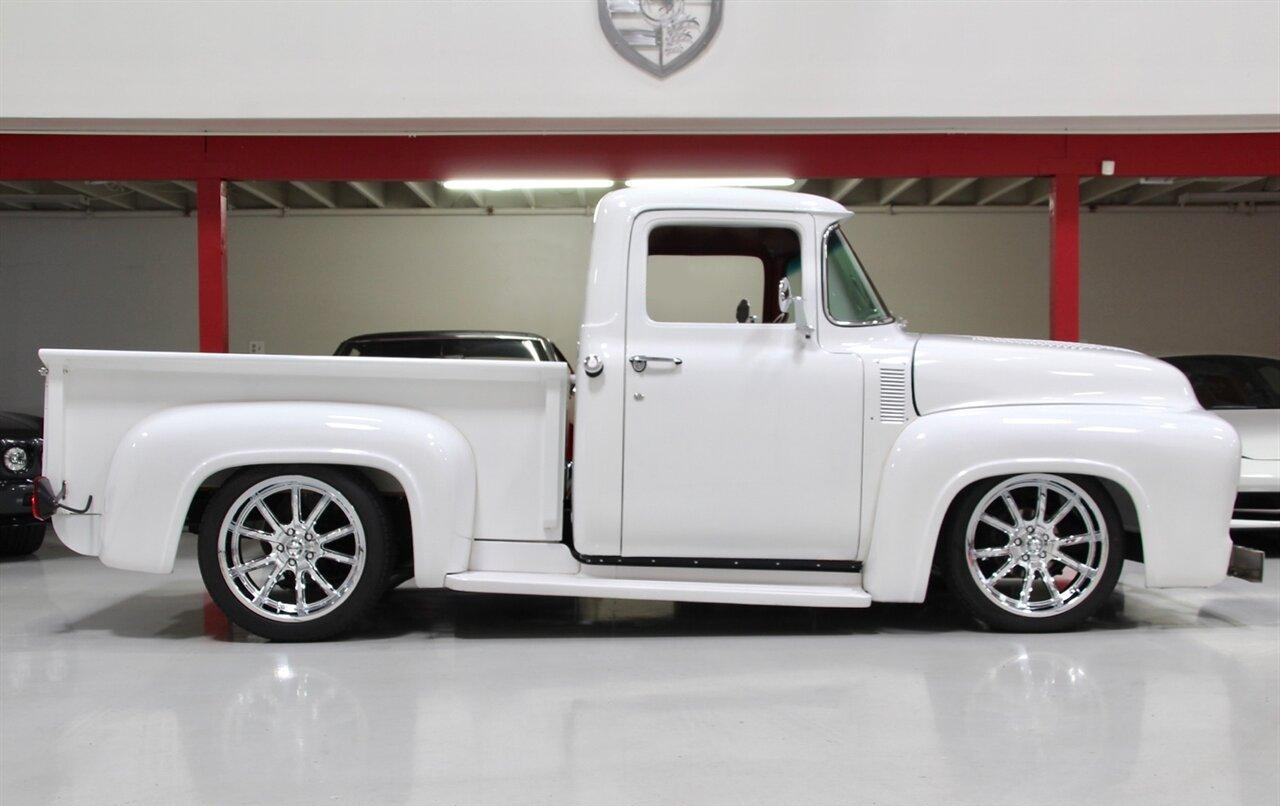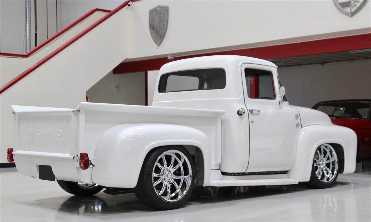 1956 Ford F-100 in White over Red Leather Interior. Equipped with a 350ci Tune Port Injected V8 Engine mated to a 700R4 Automatic Transmission. This beautiful restomod pickup has been updated with Power Steering, Power Disc brakes front and rear, Vintage Air A/C, Lanzar AM/FM radio with Bluetooth, VHX instrument cluster, Tilt steering column, Custom interior with beautiful dark red upholstery, 20" Ridler wheels, Jaguar rear end with IRS, Roll pan, Wooden bed, Headers with custom exhaust, Louvered hood, and more! The truck runs and drives great and turns heads everywhere it goes.